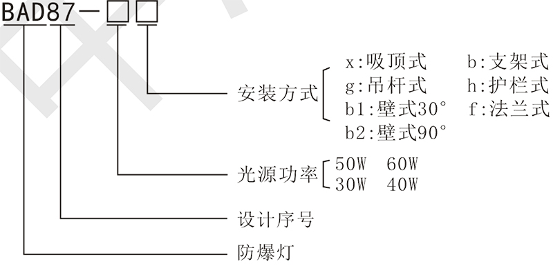 > 按照产品型号规格说明逐条选择并注明猫咪下载视频标志,例如:需要猫咪下载视频 LED 灯 50W 规格,吸顶式安装,则产品型号为 BAD87-50x ExdembⅡCT5 Gb。